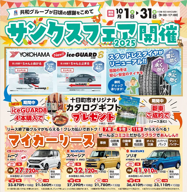 期間中に新車ご成約特典、またはヨコハマタイヤの新商品スタッドレスタイヤ”IG80(アイスガードエイト)4本(1台分)をご購入いただきますと、”十日町市オリジナルカタログギフト”をプレゼントいたします。